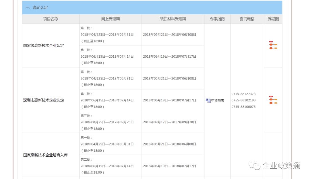 新鲜出炉!深圳市科创委公布了2018年高新技术企业认定时间发表时间:2018-04-02 21:54 受关注的2018年高新技术企业认定时间终于公布, 据悉,深圳市今年的国家高新技术企业认定工作分两批进行,与网传的三批进行有些出入。深圳市高新技术企业认定分为三批进行,同期进行的还有国家高新技术企业培育入库项目。需要特别说明的一点是,为减轻企业负担,2018年起,国家高新技术企业认定、深圳市高新技术企业认定、国家高新技术企业培育入库三个业务合并办理,科技部门统一发布申请指南、企业根据实际情况自愿选择申报其中一个或多个业务,仅需填报一份申请书具体时间如下: 2018年高新技术企业认定时间安排 第一批: 网上受理时间:4月25日--5月31日(截止至18:00) 书面材料受理时间:5月21日--6月8日 第二批: 网上受理时间:6月15日--7月14日(截止至18:00) 书面材料受理时间: 6月19日--7月17日 第三批(仅限深圳市高新技术企业认定): 网上受理时间:8月25日--9月25日(截止至18:00) 书面材料受理时间: 9月17日--9月28日